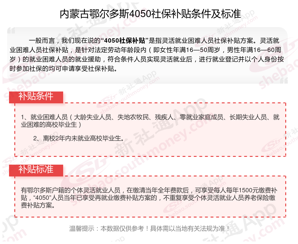 内蒙古鄂尔多斯4050社保补贴新规2025年最新标准,就业困难人员灵活就业社保补贴标准是多少钱一个月?2025内蒙古鄂尔多斯灵活就业4050社保补贴是一项面向特定年龄段的就业困难人群的社会保险补贴。