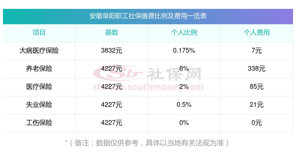 2025年安徽阜阳社保缴费多少钱?下表是2024-2025年安徽阜阳社保费用明细参考,新社通app-社保缴费查询工具提供的最新数据如下: