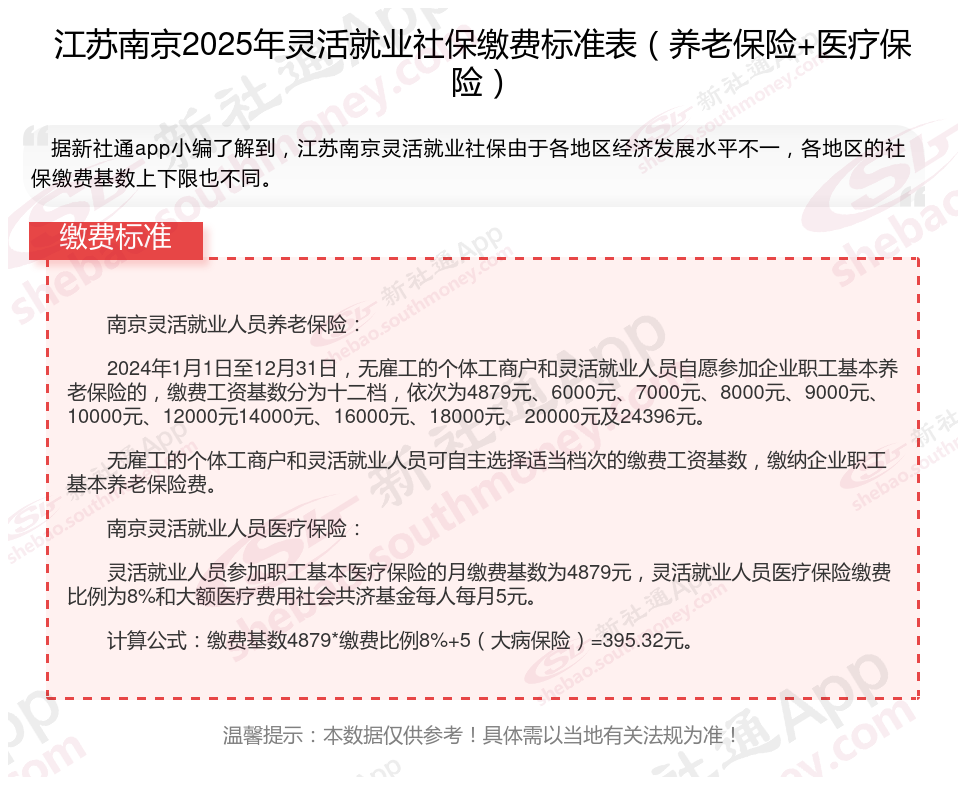 江苏南京灵活就业人员的社保缴费标准是多少?根据新社通app-社保缴费查询工具提供的最新数据如下: