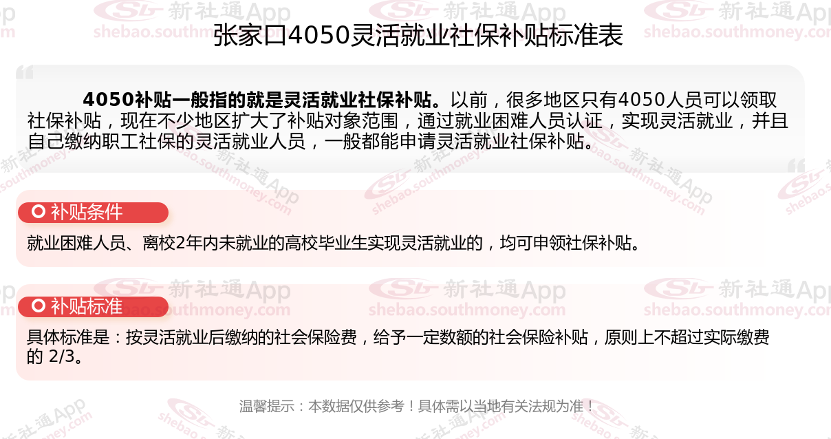 2025张家口灵活就业4050社保补贴是一项面向特定年龄段的就业困难人群的社会保险补贴。
