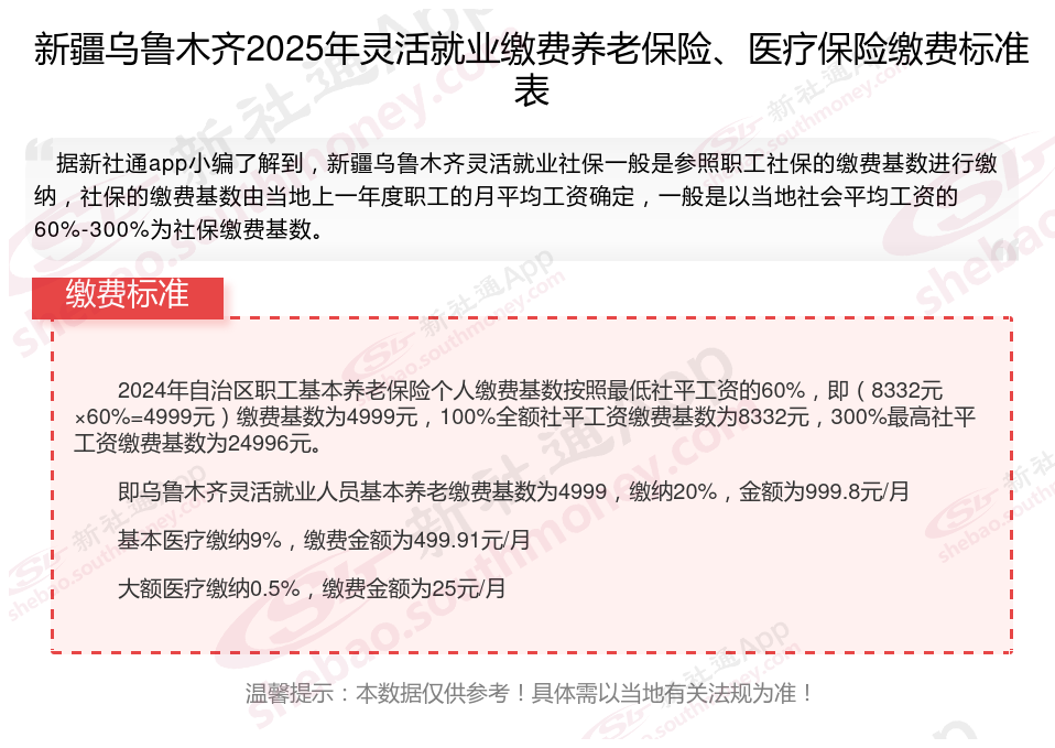 随着经济的发展和社会的进步,灵活就业人员越来越多,但是很多人不知道如何缴纳社保。本文将介绍2025年新疆乌鲁木齐灵活就业人员社保缴费基数及如何缴纳社保,能领取多少钱,帮助大家更好地了解灵活就业社保,随着新社通APP小编一起了解新疆乌鲁木齐灵活就业社保缴费最新资讯吧。