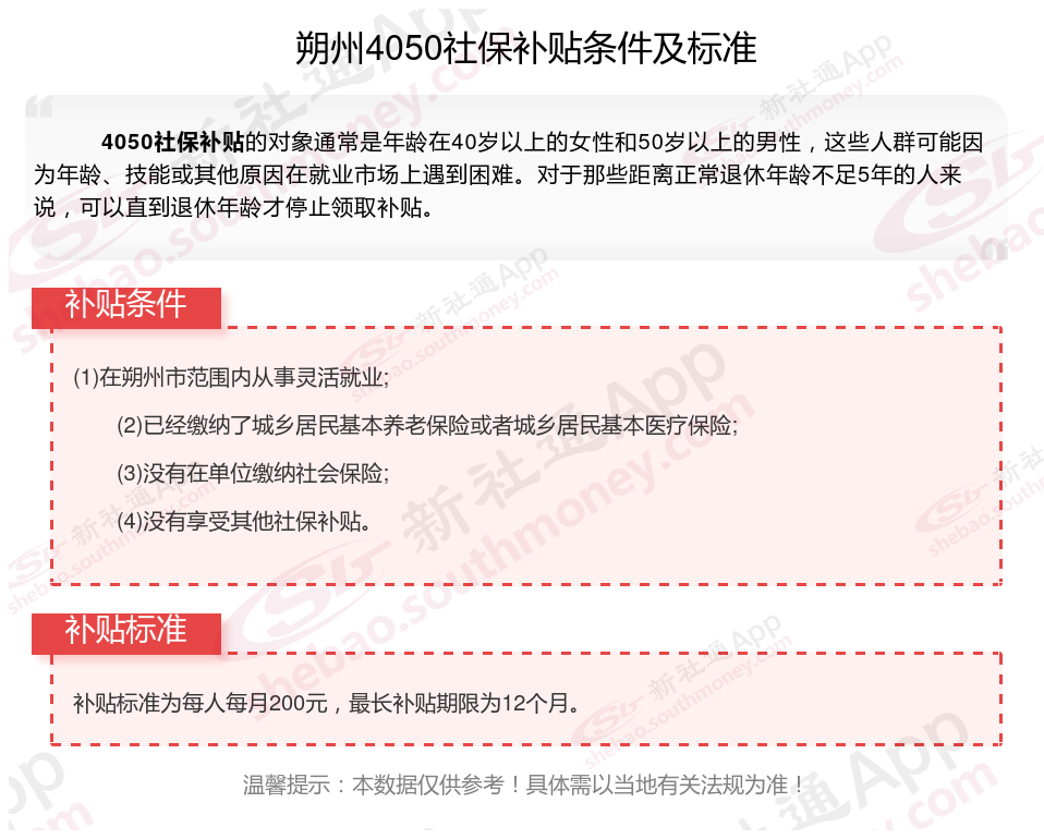 今天聊一下4050补贴的相关内容。4050补贴听起来像是一个针对特定年龄人群的社保补贴。比如女性需年满40周岁,男性需年满50周岁(以申请当年12月31日为截止日期)。那么朔州4050灵活就业困难人员社保补贴多少钱?朔州4050社保补贴可以申请吗?接下来随新社通APP小编具体了解一下4050社保补贴内容。