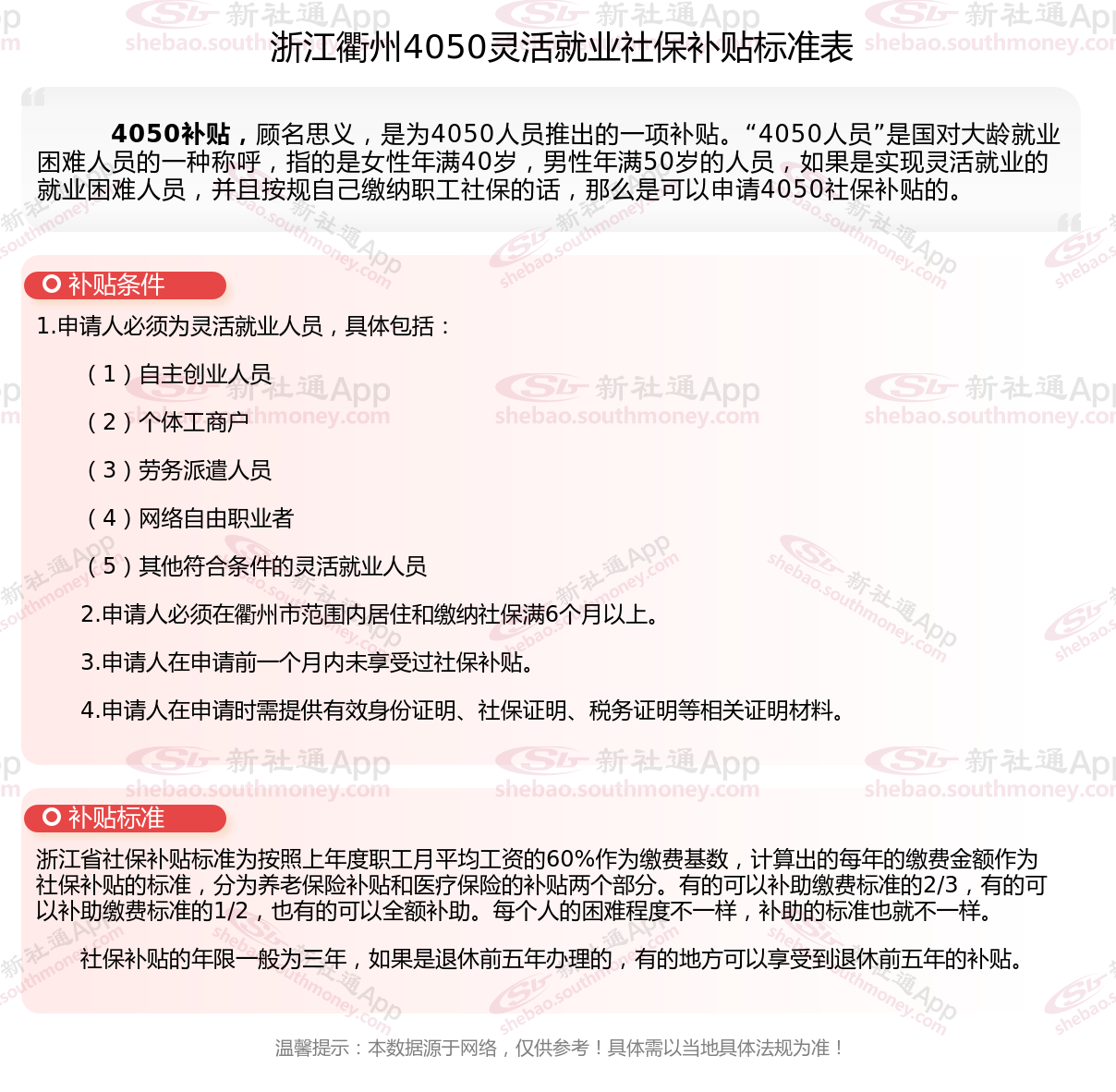 二、2025年浙江衢州灵活就业4050社保补贴标准及条件是什么?来了解一下