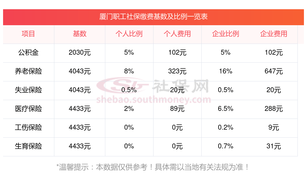 厦门2025年社保养老保险缴费标准是多少?下表是2025年厦门社保费用明细参考,新社通app-社保缴费查询工具提供的最新数据如下: