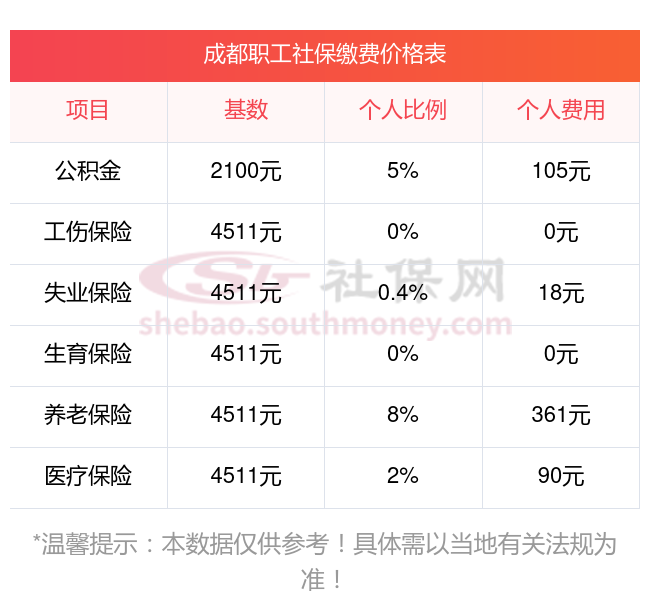 2025年成都社保缴费最低基数及个人和单位具体是多少钱?下表是2025年成都社保费用明细参考,新社通app-社保缴费查询工具提供的最新数据如下: