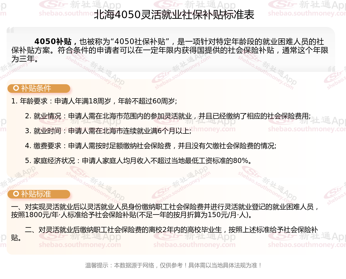 二、2025年北海4050社保补贴标准及条件,最新如下: