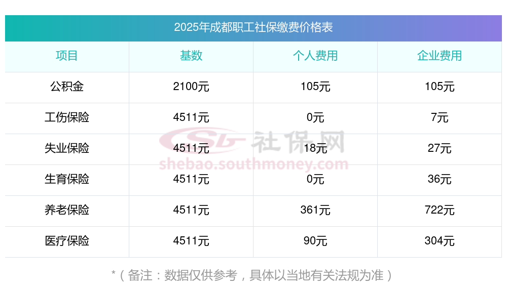 成都2025年社保养老保险缴费标准是多少?下表是2025年成都社保费用明细参考,新社通app-社保缴费查询工具提供的最新数据如下: