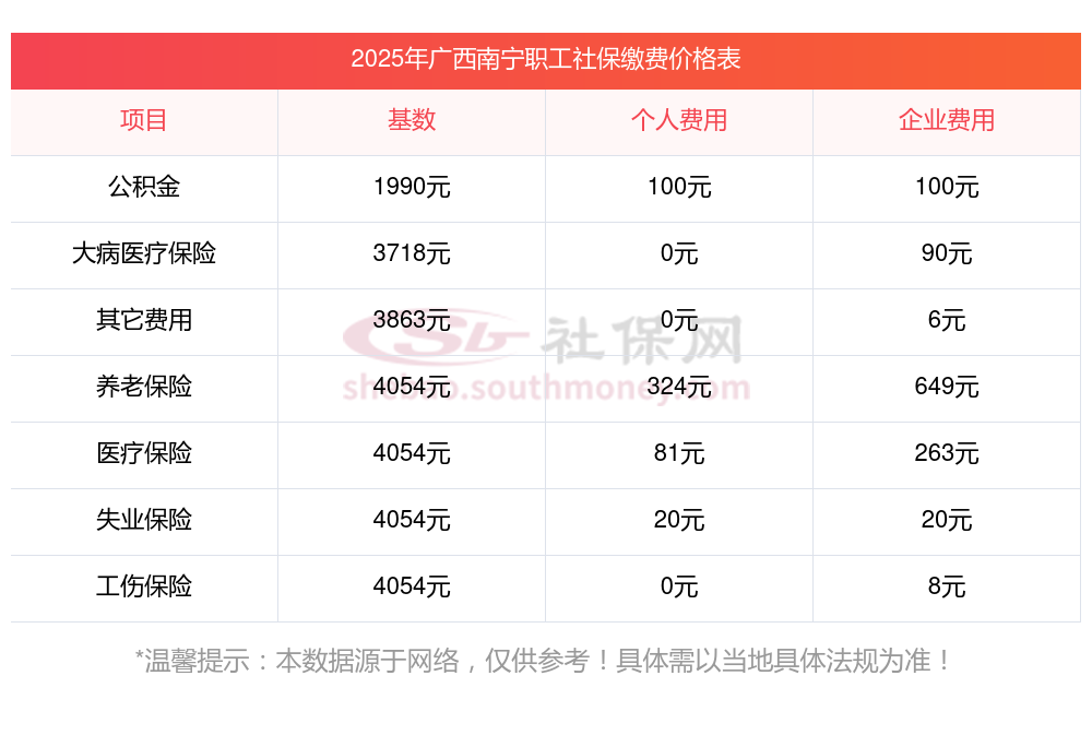 2025年广西南宁社保缴费多少钱?下表是2023-2024年广西南宁社保费用明细参考,新社通app-社保缴费查询工具提供的最新数据如下:
