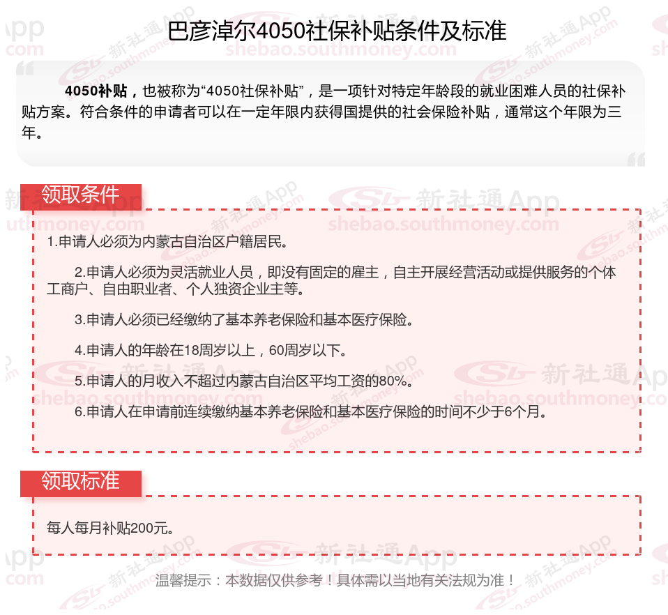 二、2025年巴彦淖尔4050社保补贴标准及条件,最新如下: