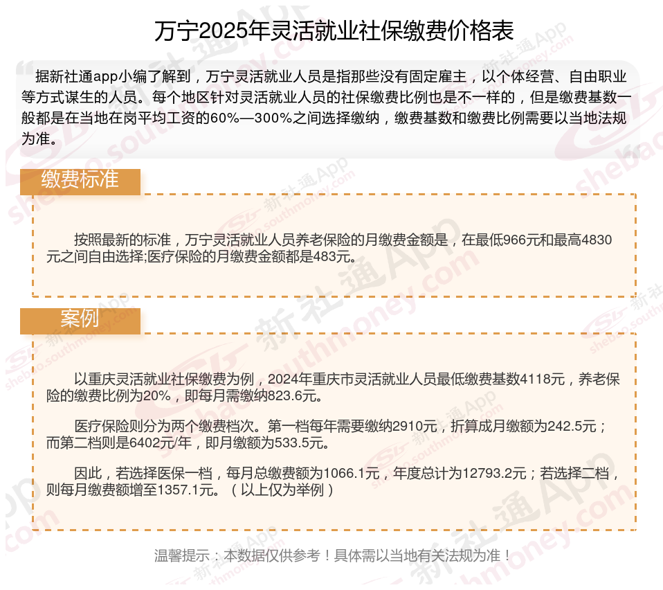 据新社通app数据显示,万宁灵活就业养老保险的缴费基数为:4830元。灵活就业人员参保缴费的比例为个人20%。