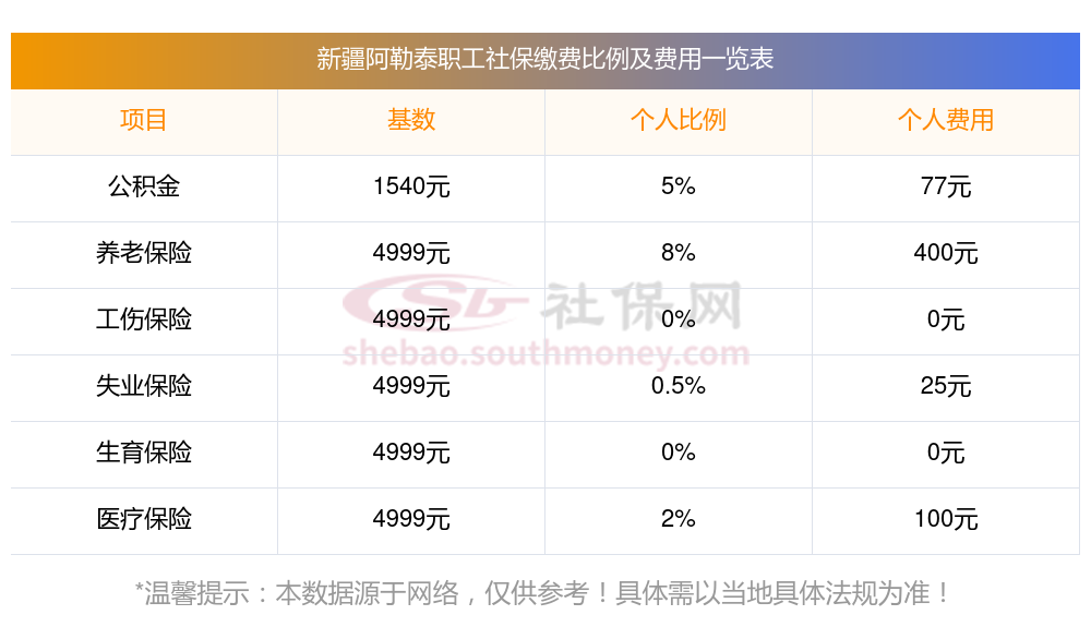 2025年新疆阿勒泰社保缴费多少钱?下表是2024-2025年新疆阿勒泰社保费用明细参考,新社通app-社保缴费查询工具提供的最新数据如下: