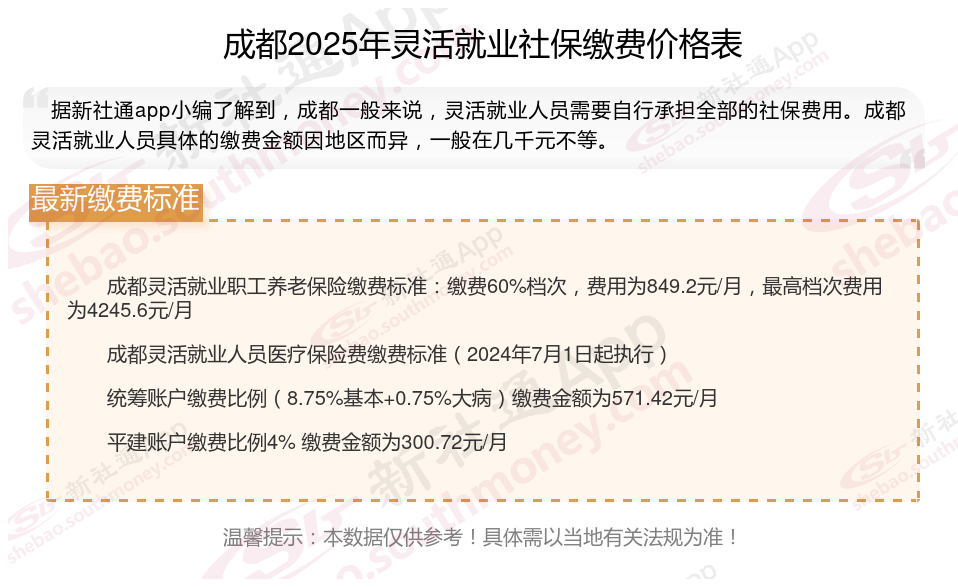 据新社通app数据显示,成都灵活就业养老保险缴费基数2024-2025年最新标准如下: