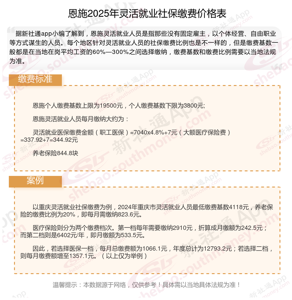 一、2025年恩施灵活就业社保缴费标准公布啦 恩施灵活就业社保多少钱一个月?