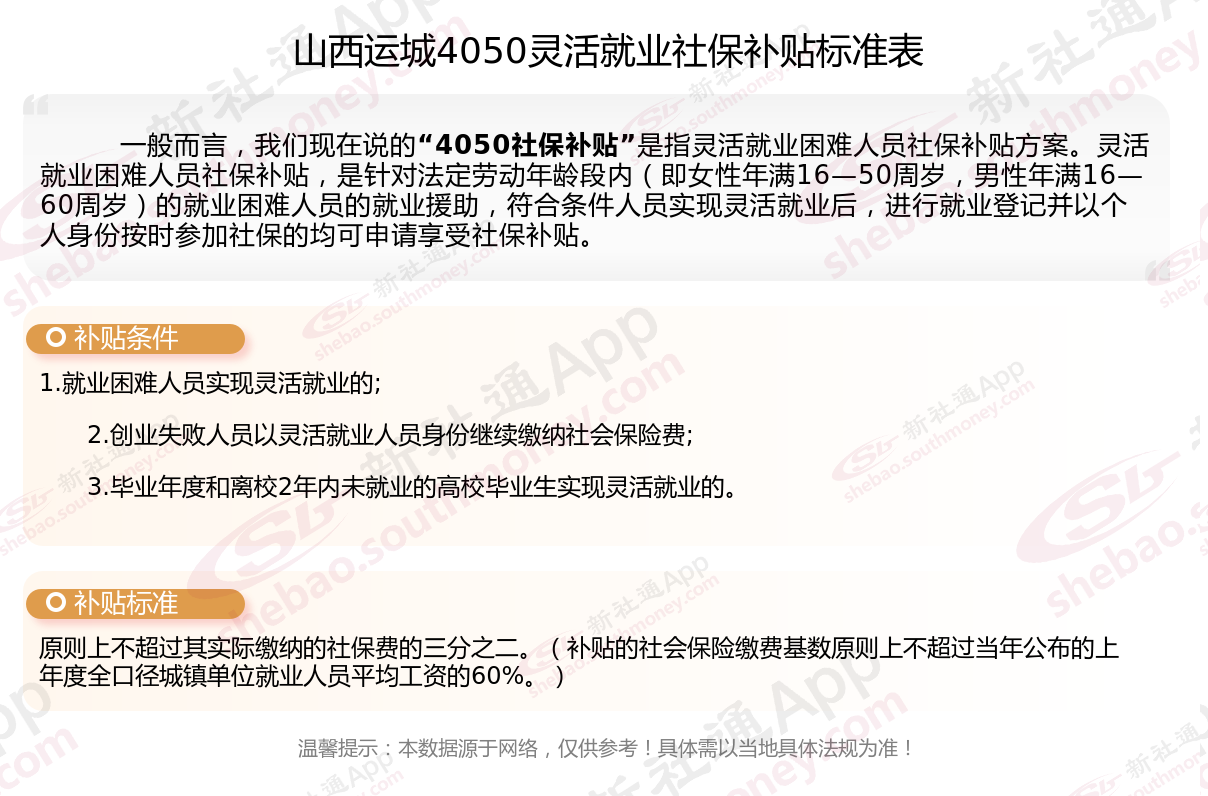 今天聊一下4050补贴的相关内容。4050补贴听起来像是一个针对特定年龄人群的社保补贴。比如女性需年满40周岁,男性需年满50周岁(以申请当年12月31日为截止日期)。那么山西运城4050灵活就业困难人员社保补贴多少钱?山西运城4050社保补贴可以申请吗?接下来随新社通APP小编具体了解一下4050社保补贴内容。