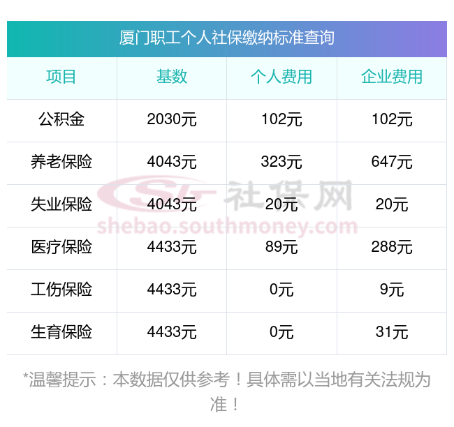 2025年厦门社保缴费多少钱?下表是2023-2024年厦门社保费用明细参考,新社通app-社保缴费查询工具提供的最新数据如下: