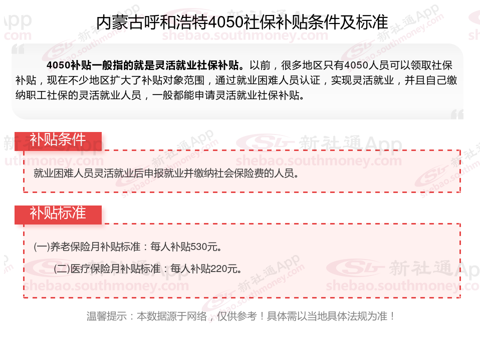 二、2025年内蒙古呼和浩特4050社保补贴标准及条件(4050社保补贴多少钱?)