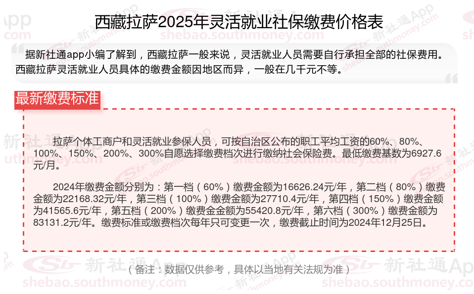 拉萨个体工商户和灵活就业参保人员,可按自治区公布的职工平均工资的60%、80%、100%、150%、200%、300%自愿选择缴费档次进行缴纳社会保险费。最低缴费基数为6927.6元/月。