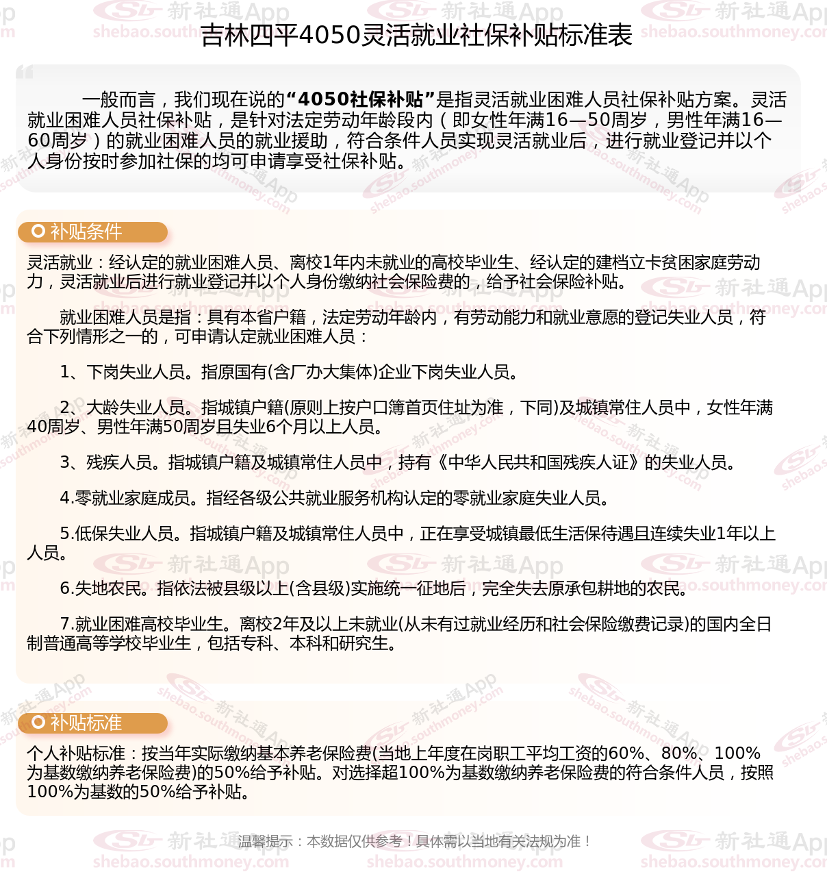 今天聊一下4050补贴的相关内容。4050补贴听起来像是一个针对特定年龄人群的社保补贴。比如女性需年满40周岁,男性需年满50周岁(以申请当年12月31日为截止日期)。那么吉林四平4050灵活就业困难人员社保补贴多少钱?吉林四平4050社保补贴可以申请吗?接下来随新社通APP小编具体了解一下4050社保补贴内容。