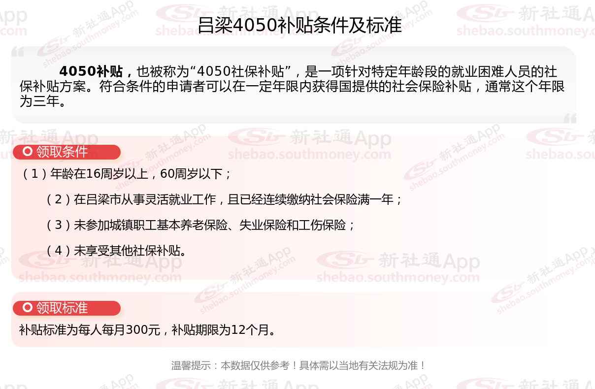 2025吕梁4050补贴主要针对的是年龄在40岁以上的女性和50岁以上的男性,这些人群通常因为年龄较大而面临就业困难。