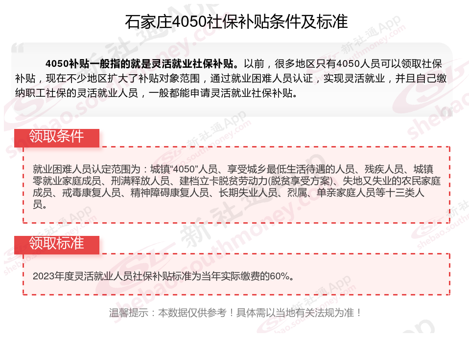 2025石家庄4050补贴主要针对的是年龄在40岁以上的女性和50岁以上的男性,这些人群通常因为年龄较大而面临就业困难。