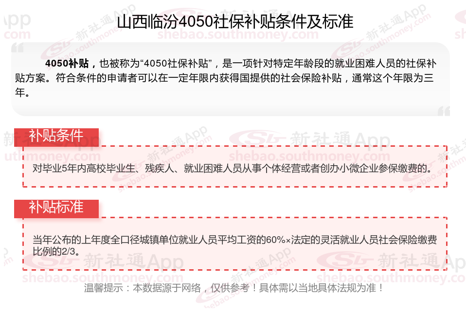 山西临汾4050社保补贴多少钱一个月?山西临汾4050社保补贴2025年最新标准是多少?2025山西临汾4050补贴主要针对的是年龄在40岁以上的女性和50岁以上的男性,这些人群通常因为年龄较大而面临就业困难。