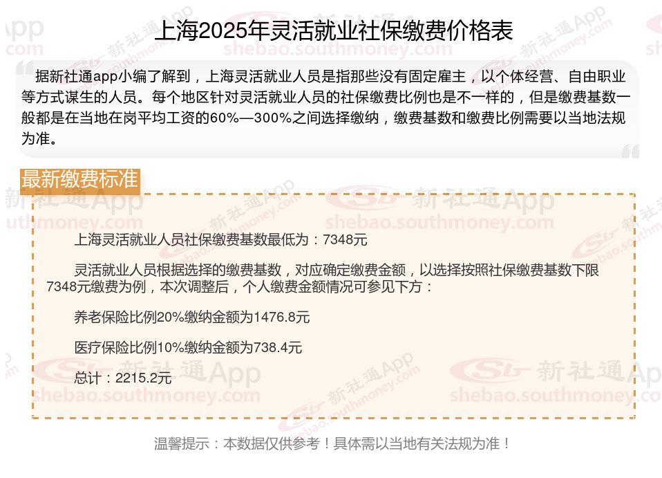 据新社通app数据显示,上海灵活就业养老保险的缴费基数为:7384元。灵活就业人员参保缴费的比例为个人20%。