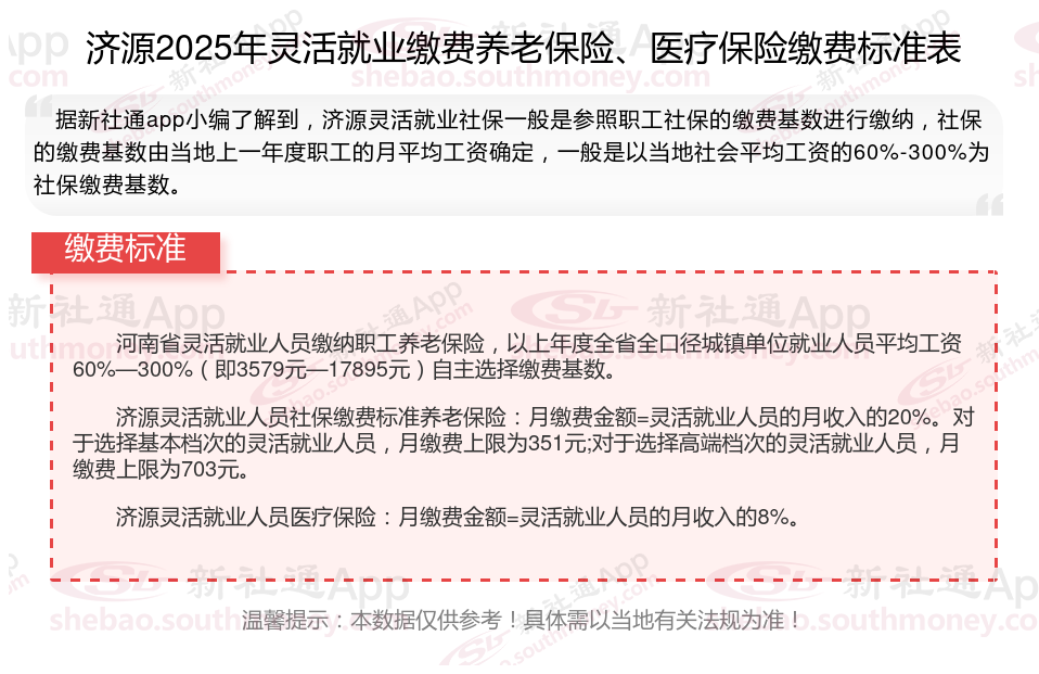 据新社通app数据显示,济源灵活就业人员养老保险缴费基数2024-2025年最新标准如下: