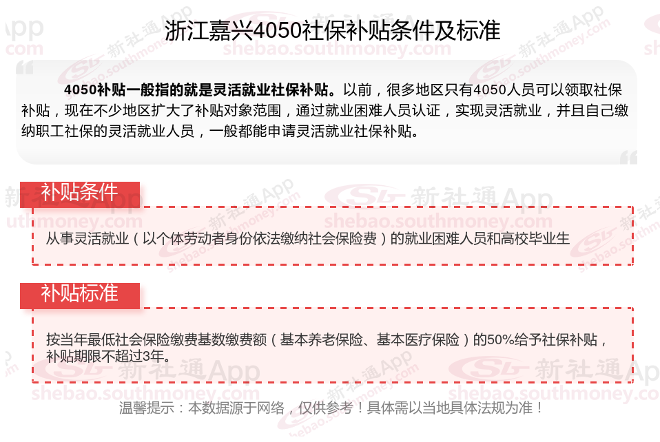 一、2023-2024年浙江嘉兴4050社保补贴标准及条件,最新如下