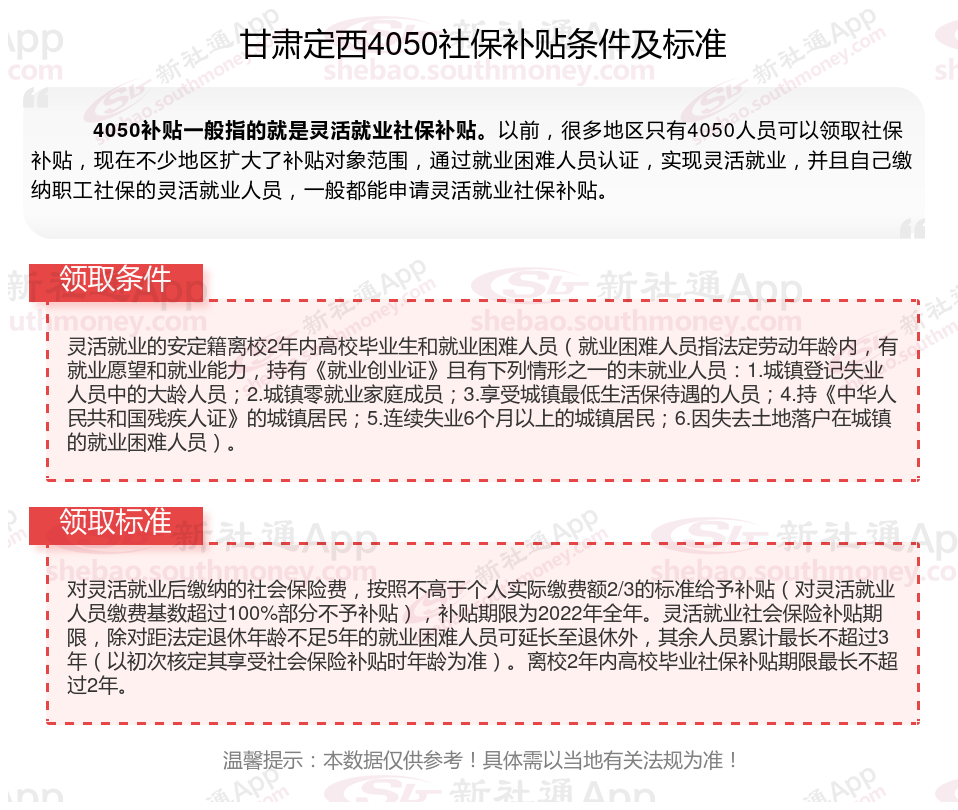 二、甘肃定西4050社保补贴标准及条件4050社保补贴,最新如下