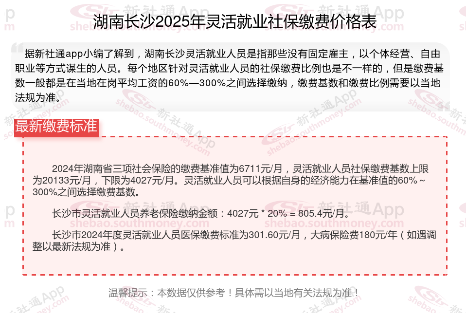 据新社通app数据显示,湖南长沙灵活就业人员养老缴费基数2024-2025年最新标准如下: