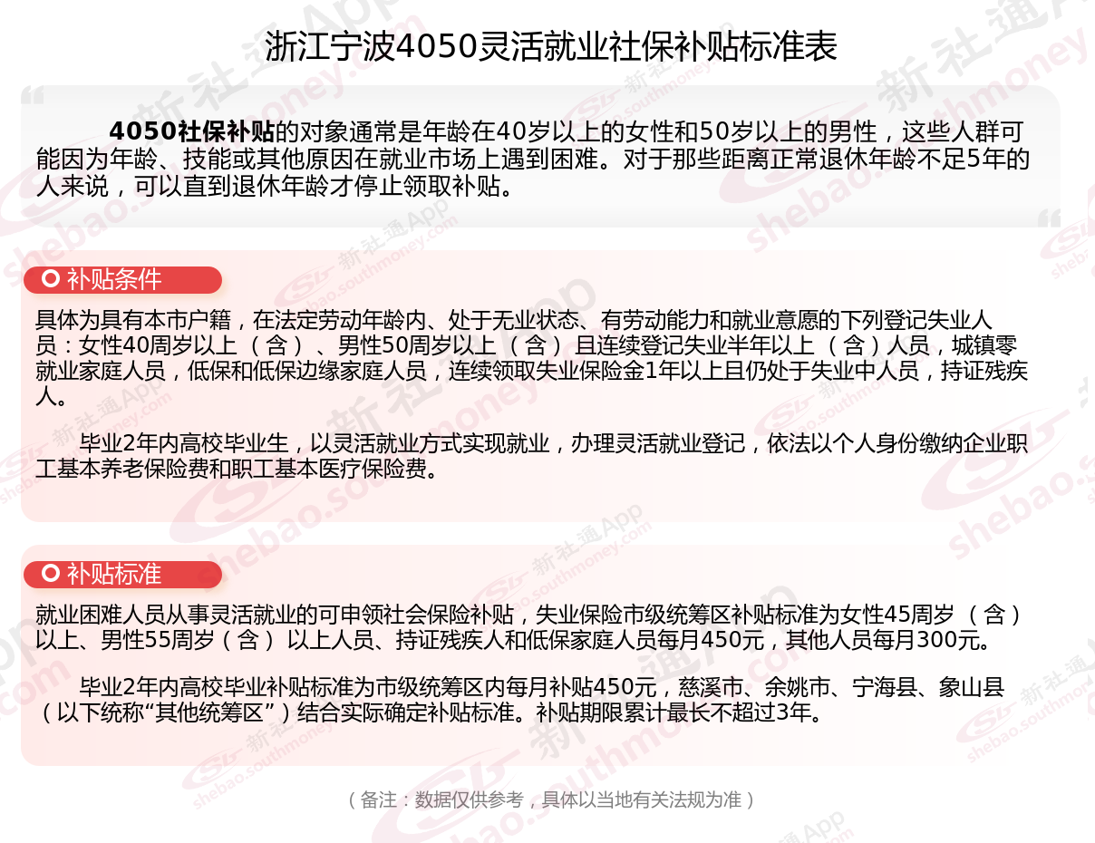 一、2025年浙江宁波灵活就业4050社保补贴标准及条件是什么