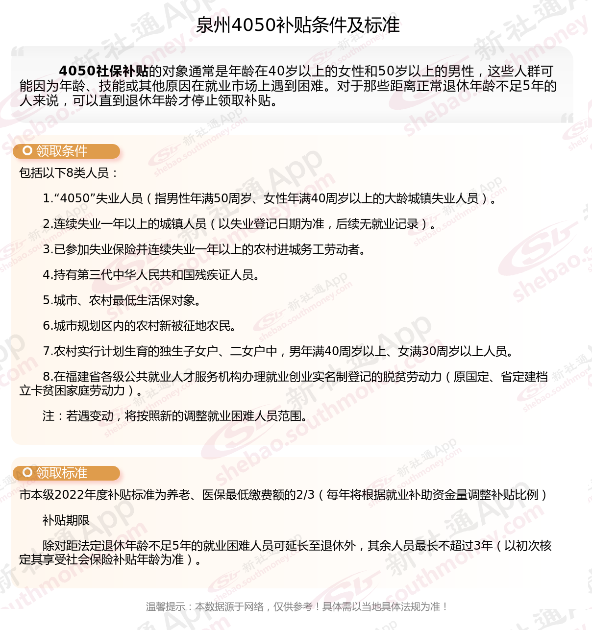 2025泉州4050补贴主要针对的是年龄在40岁以上的女性和50岁以上的男性,这些人群通常因为年龄较大而面临就业困难。