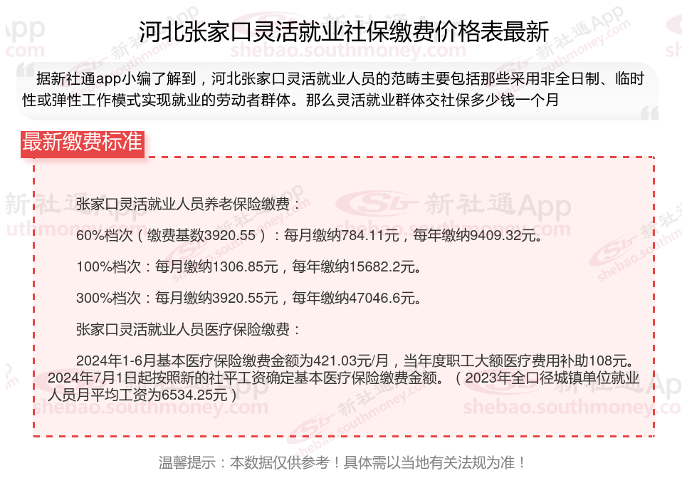 据新社通app数据显示,河北张家口灵活就业人员养老缴费基数2024-2025年最新标准如下: