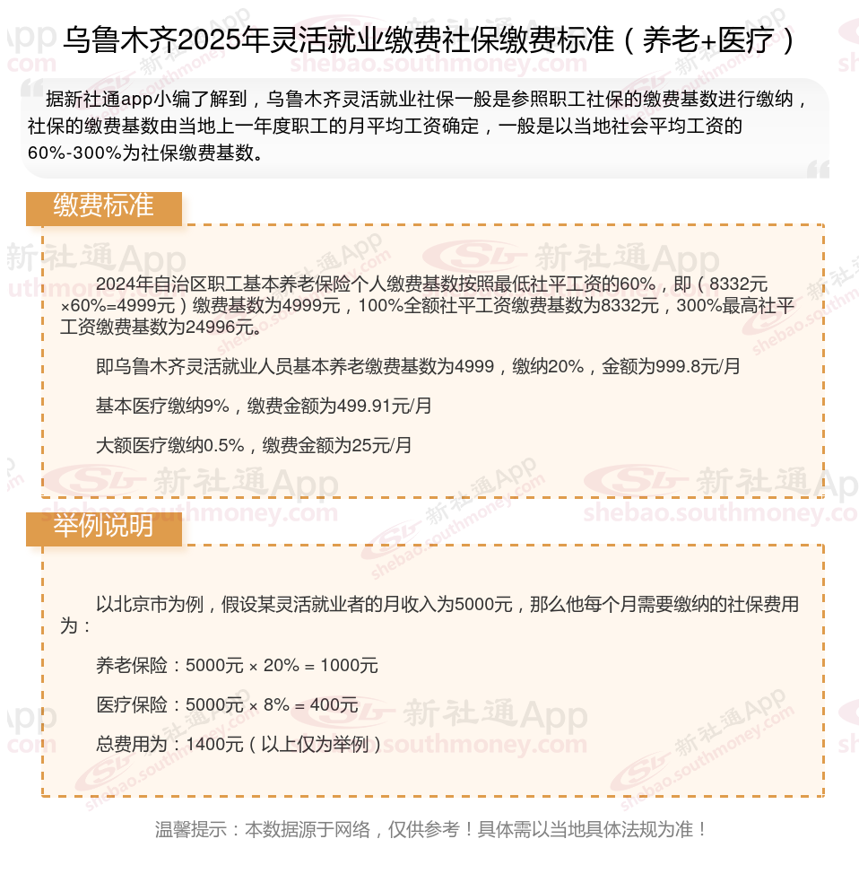 据新社通app数据显示,乌鲁木齐灵活就业养老保险缴费基数2024-2025年最新标准如下: