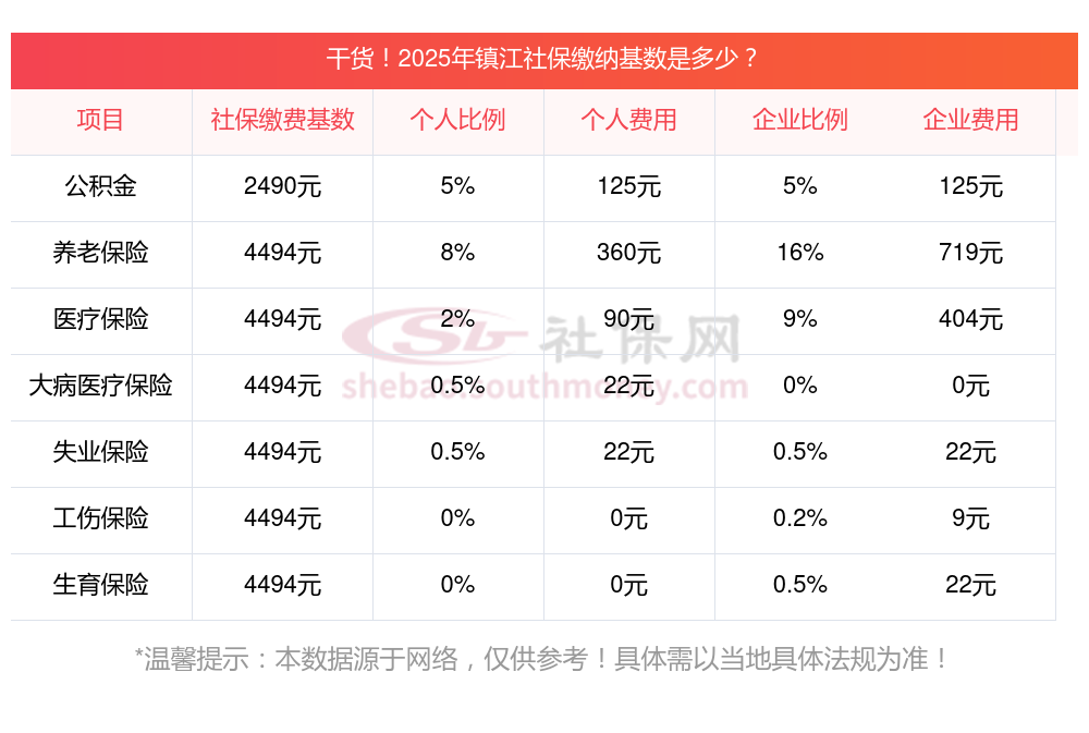 2025年镇江社保缴费多少钱?下表是2024-2025年镇江社保费用明细参考,新社通app-社保缴费查询工具提供的最新数据如下: