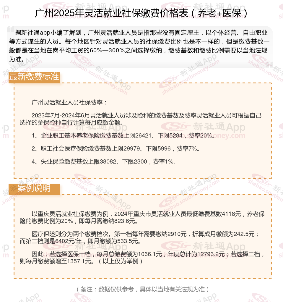据新社通app数据显示,2024-2025年广州灵活就业人员养老保险的缴费标准是根据缴费基数来确定的: