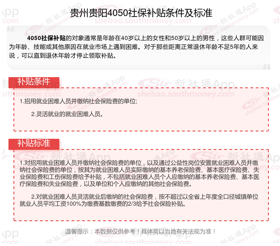 二、2025年贵州贵阳4050社保补贴标准及条件,最新如下: