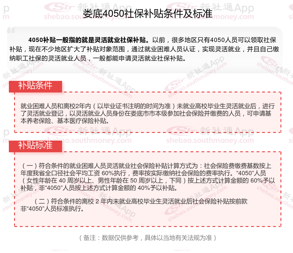 二、2025年娄底4050社保补贴标准及条件,最新如下: