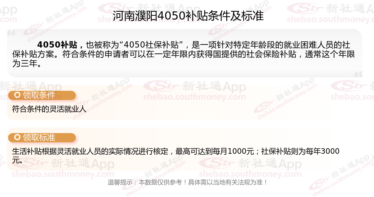 一、河南濮阳4050社保补贴标准及条件是多少?