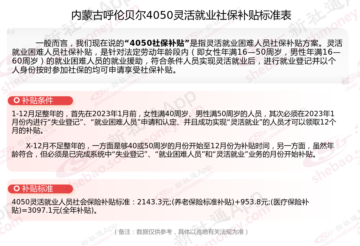 一、2023-2024年内蒙古呼伦贝尔4050社保补贴标准及条件,最新如下