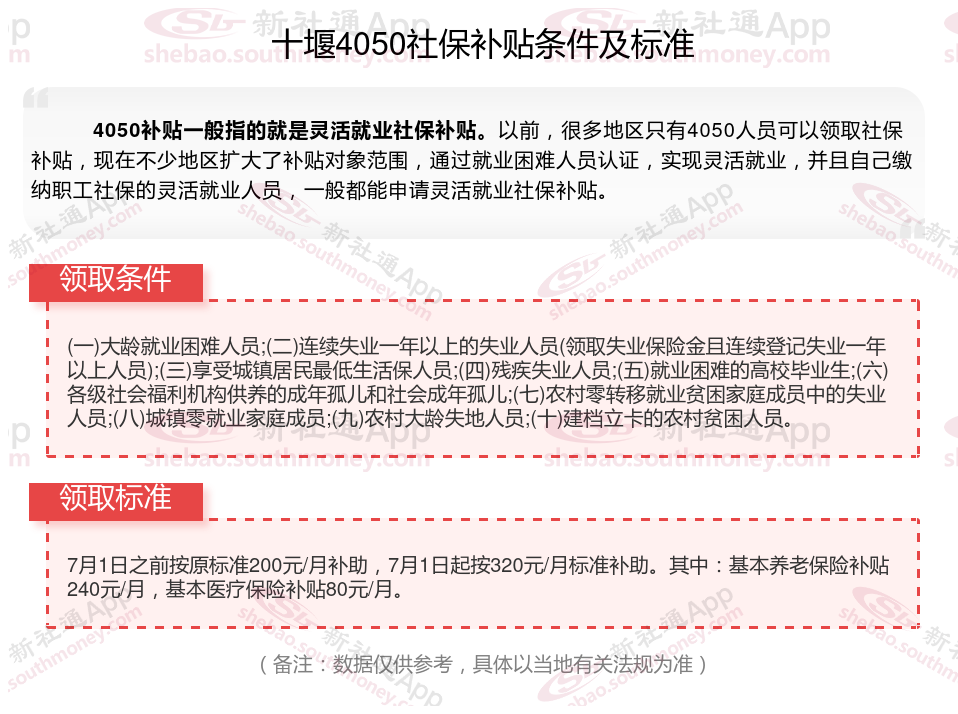 4050补贴需要以灵活就业身份参加职工养老和医疗保险,补贴标准不超过实际缴费的三分之二,最长3年,距离退休不足5年的可延长到退休。补贴对象包括国企下岗人员、低保家庭等。申请流程需要提交身份证、银行账户等。那么十堰4050灵活就业社保补贴标准是多少钱?十堰4050社保补贴条件是什么?接下来随新社通APP小编了解一下最新资讯。