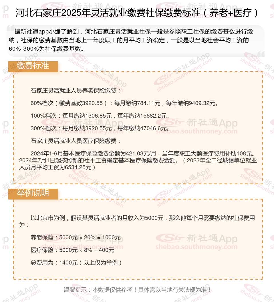 据新社通app数据显示,2024-2025年河北石家庄灵活就业人员养老保险的缴费标准: