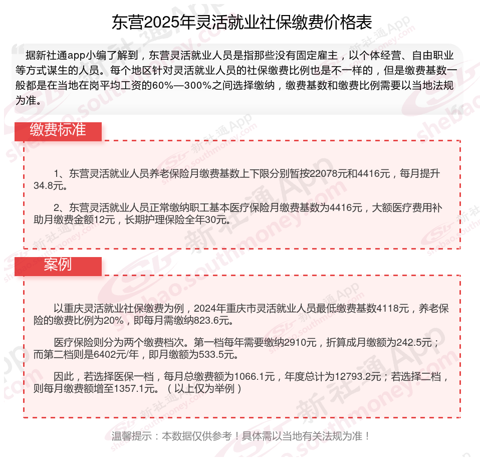 2025东营灵活就业社保缴费价格是多少钱一个月?根据新社通app-社保缴费查询工具提供的最新数据如下: