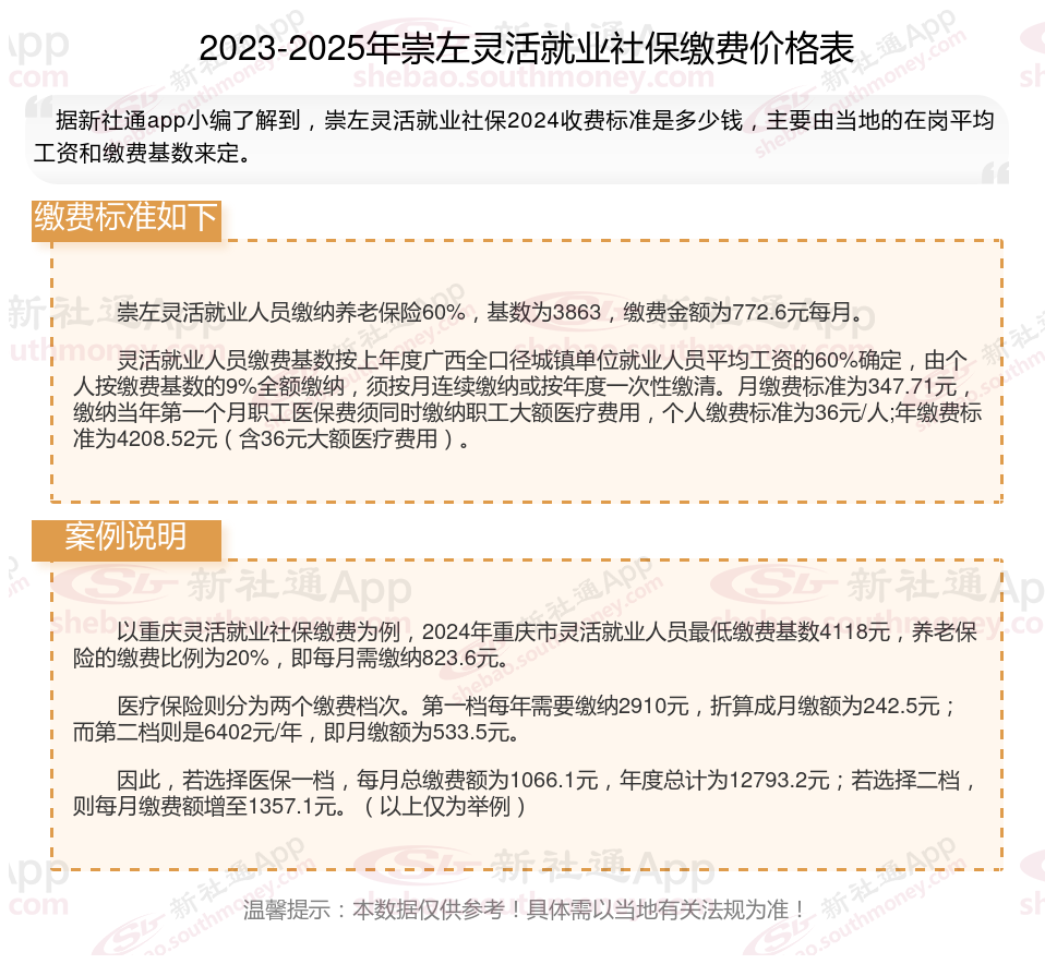 据新社通app数据显示,2024-2025年崇左灵活就业人员养老保险的缴费标准: