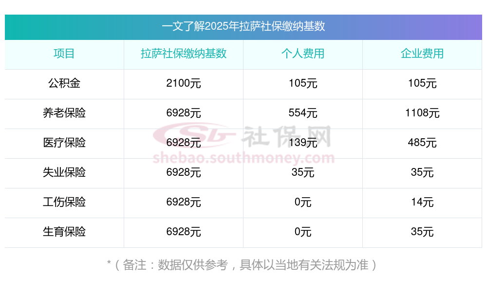 2025年拉萨5险缴费标准是多少,2025年拉萨社保缴费多少钱?下表是2025年拉萨社保费用明细参考,新社通app-社保缴费查询工具提供的最新数据如下: