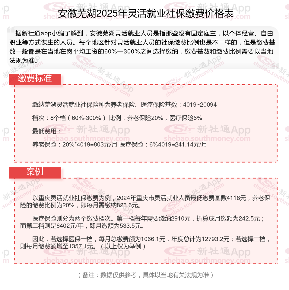 那么,灵活就业者社保是多少钱一个月 安徽芜湖灵活社保交多少钱?根据新社通app-社保缴费查询工具提供的2025社保缴费标准详情数据: