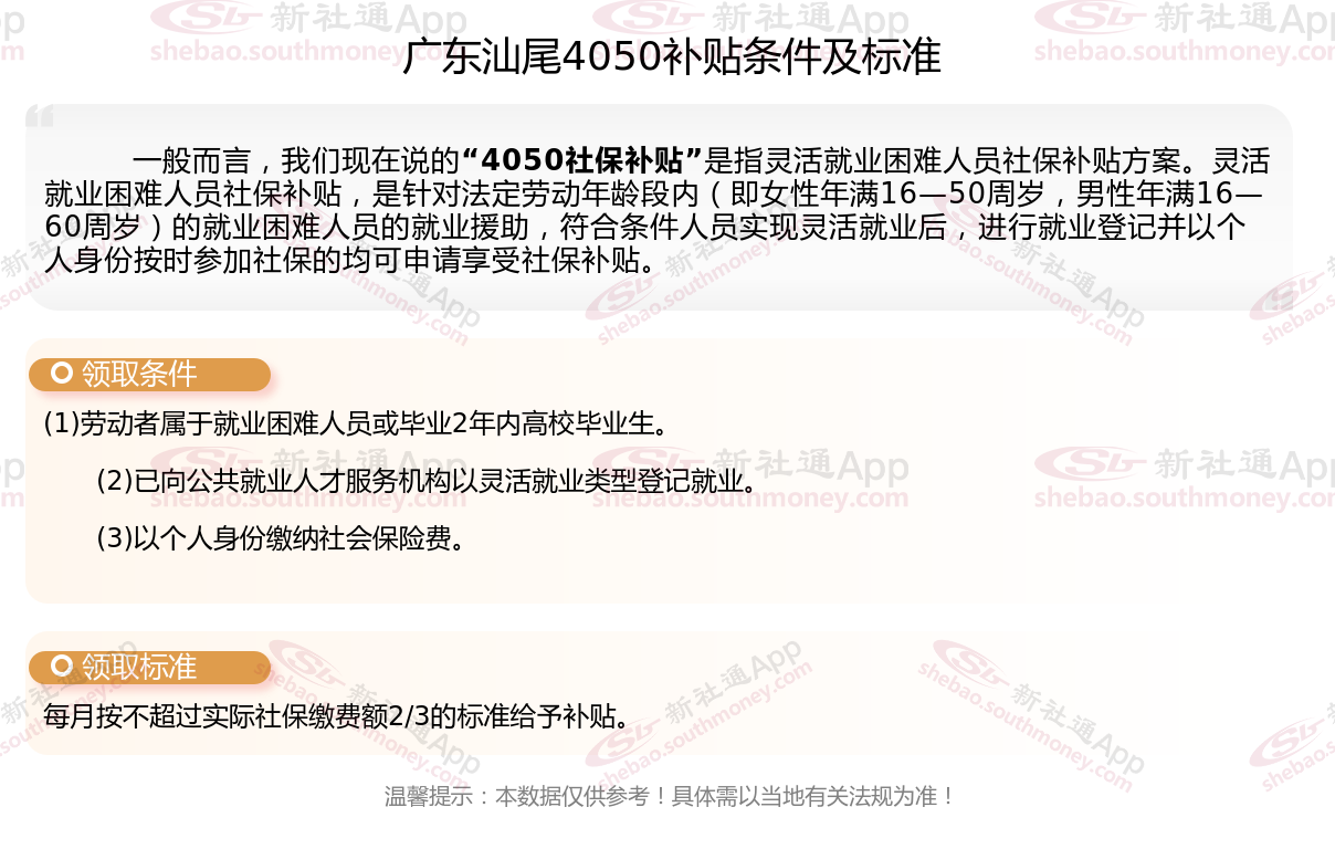二、2025年广东汕尾4050社保补贴标准是多少?领取条件是什么?
