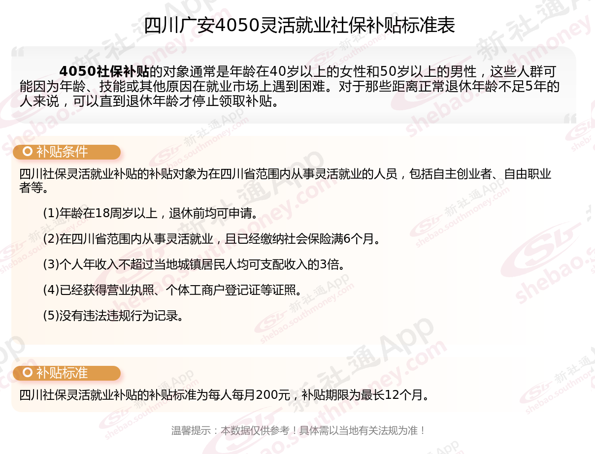一、2023-2024年四川广安4050社保补贴标准及条件是多少?