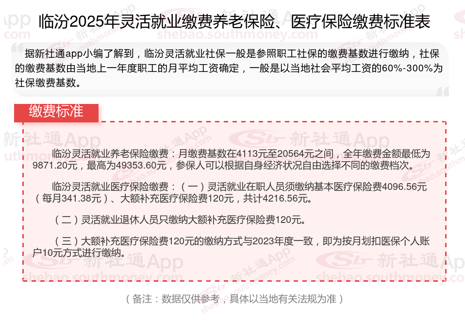 据新社通app数据显示,临汾灵活就业人员养老缴费基数2024-2025年最新标准如下: