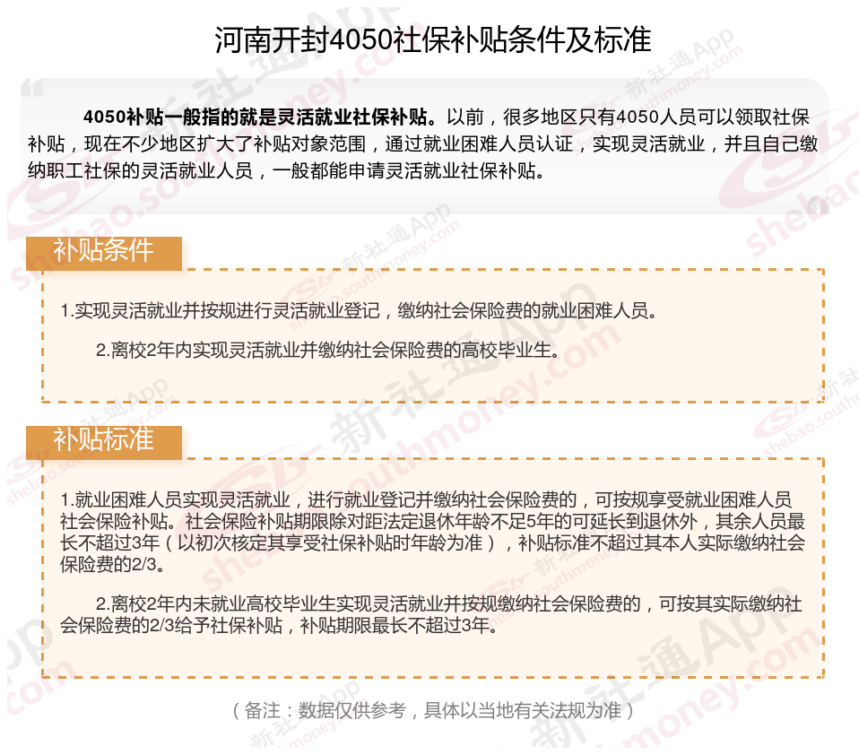 河南开封4050灵活就业社保补贴是什么?今天聊一下4050补贴话题。4050补贴听起来像是一个针对特定年龄人群的社保补贴。比如女性需年满40周岁,男性需年满50周岁(以申请当年12月31日为截止日期)。那么河南开封4050灵活就业社保补贴标准是多少钱?河南开封4050社保补贴可以领取多少?接下来随新社通APP小编了解一下河南开封4050灵活就业社保补贴的最新资讯。